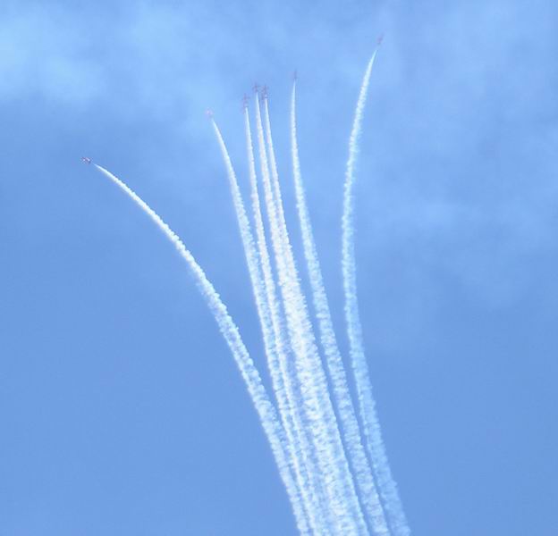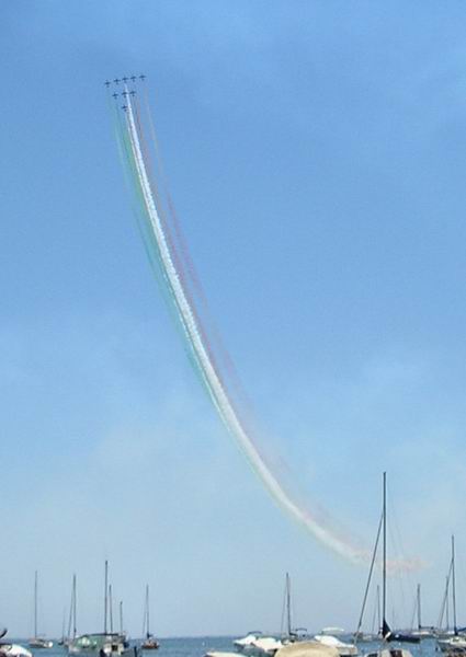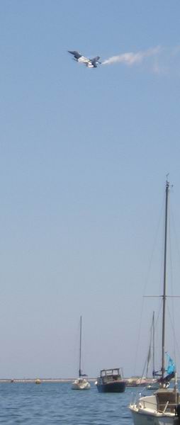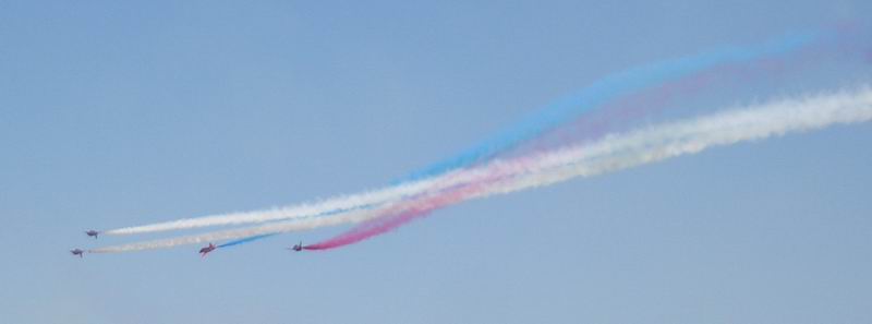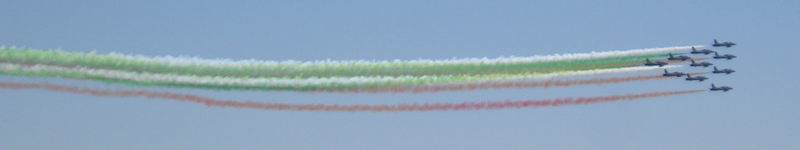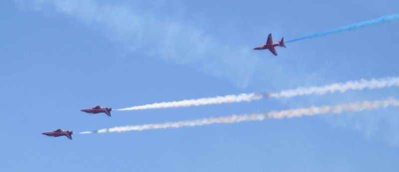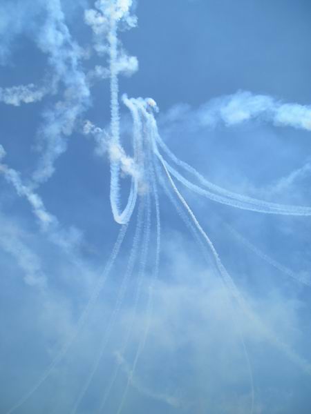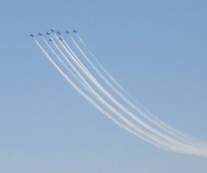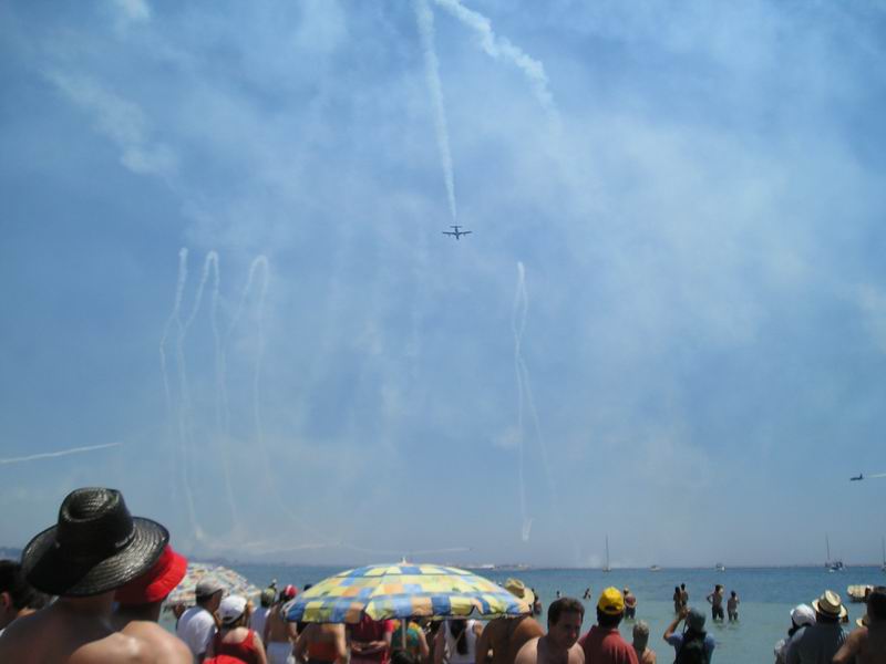 | AEREO 06 - MURCIA Seguimos flipaos con las maniobras de algunos... la escuadrilla de los italianos son un pasote, y no hablemos ya de los asquerosos de los ingleses. la escuadrilla Red Arrow (Flecha Roja). También nos deleitó con algunas chulerías un F-15... no veas, que caña de motor, que diferencia entre el rugido de ese y el de los aviones de acrobacia... además, se notaba un avión mucho más "pesado". También vimos un Mirage noseke, que se puso a hacer también piruetas... |